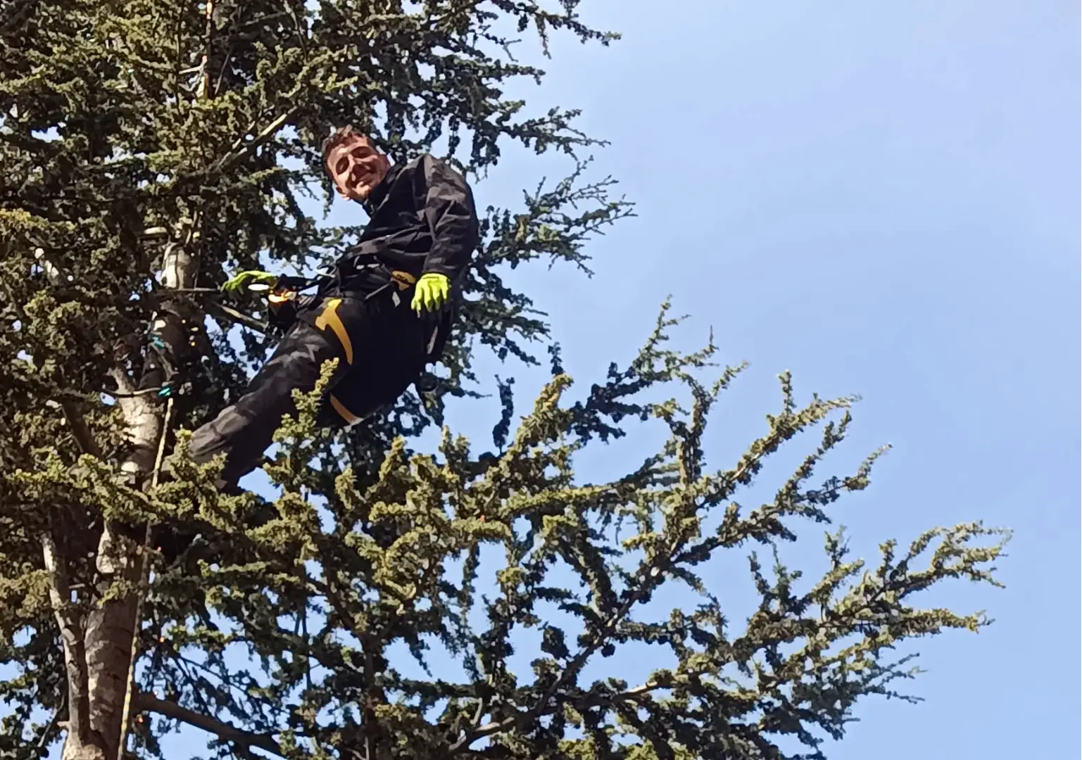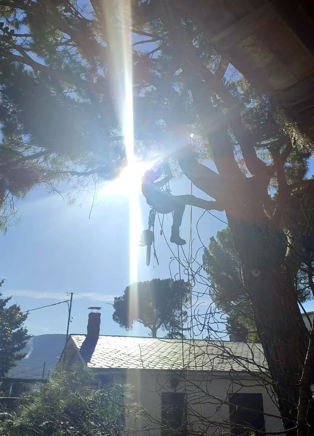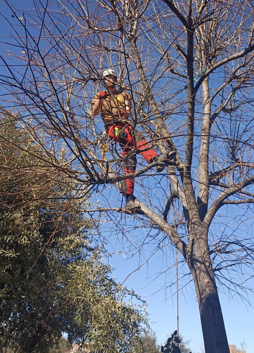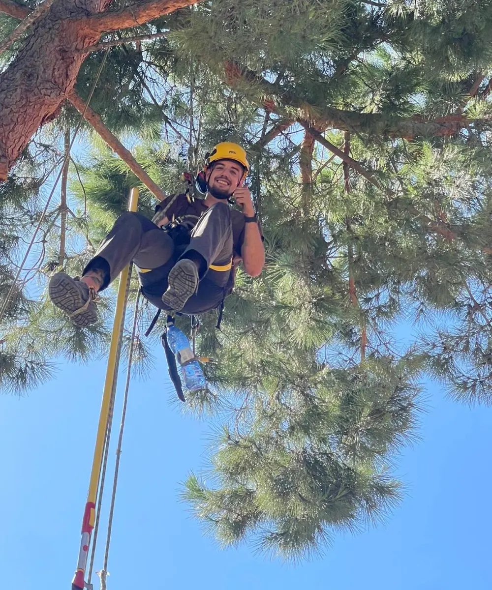 Especialistas en poda en trepa, la técnica con cuerdas más respetuosa y precisa para trabajos de altura, complementada con el uso de cesta elevadora.